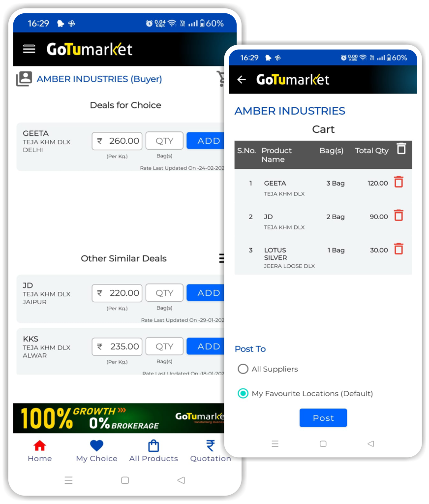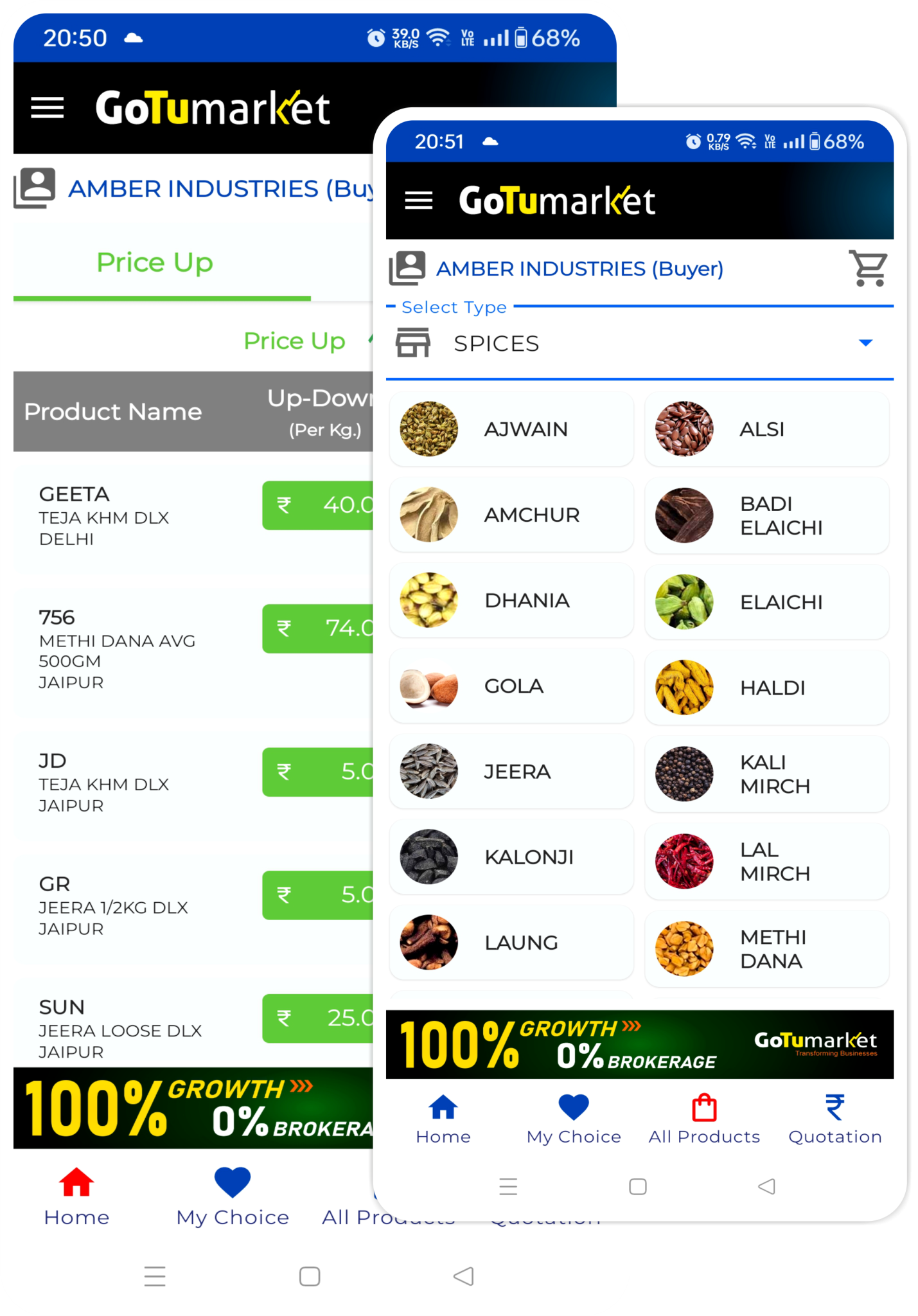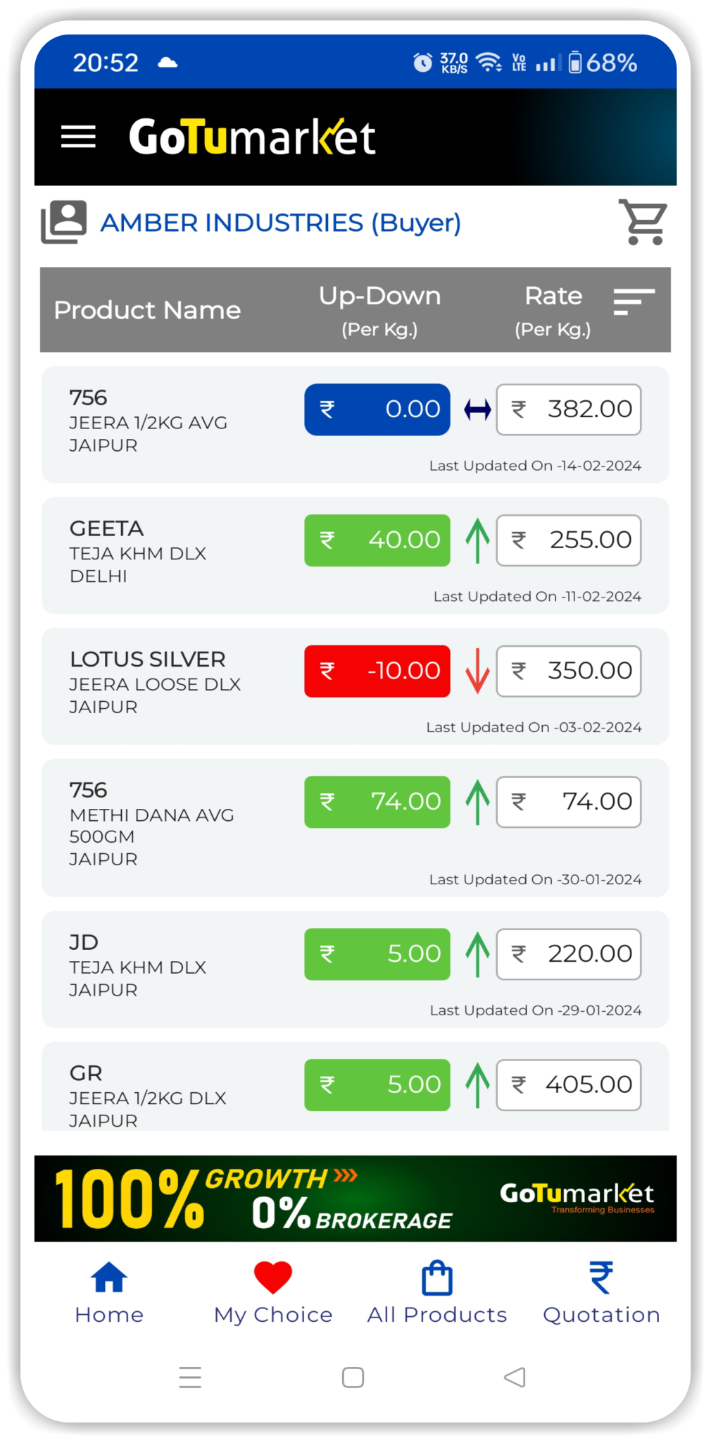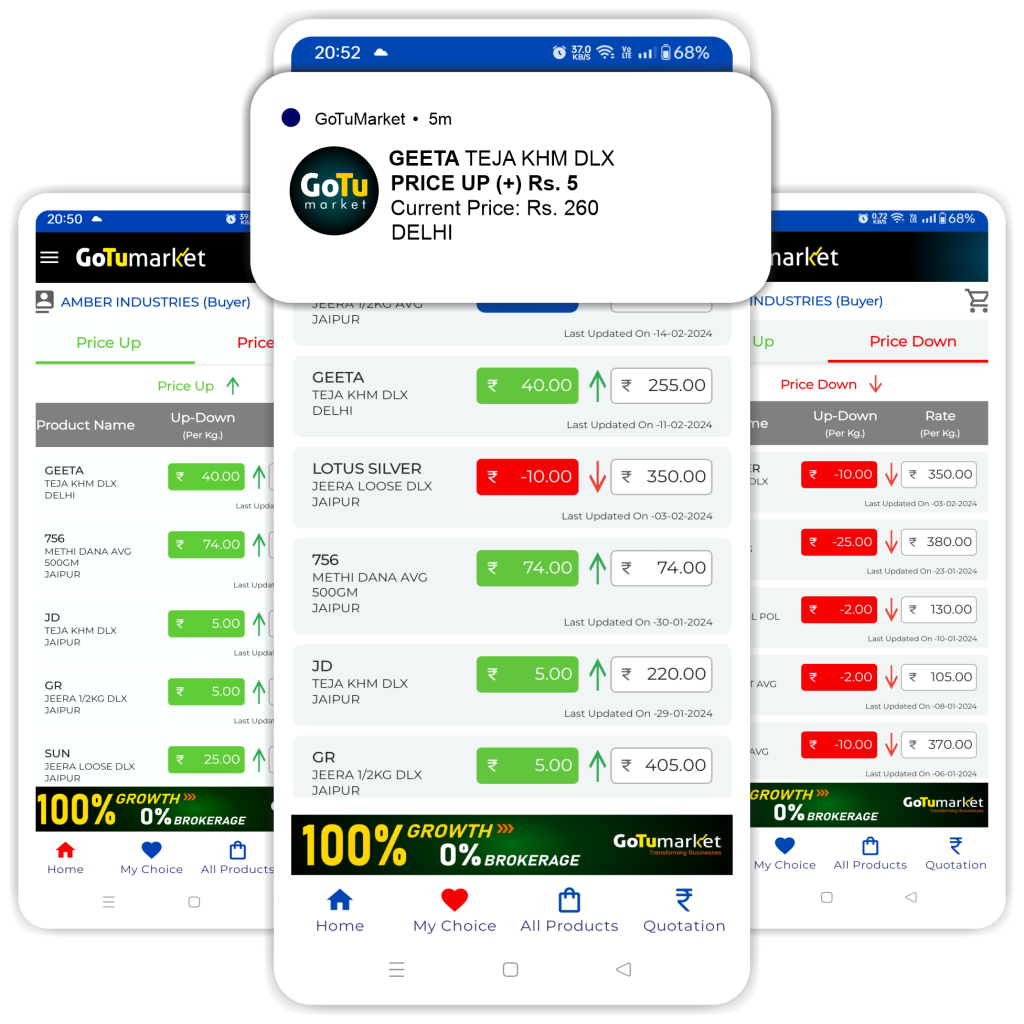 Get updated with daily market up/down updates on application and via notifications of various branded food commodities like spices, dry-fruits and other kirana items from different mandis and markets.
